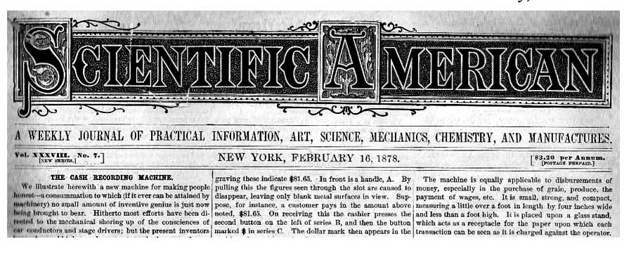 There are a number of stories of how the idea of a cash register came into being. They all stem from similar concerns. A Scientific American article from February, 1878 featured