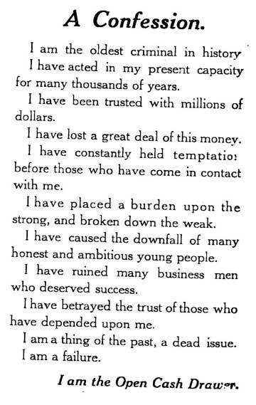 “It is an automatic cashier which records mechanically every sale made in a store. It never tires. It never does one things while thinking about another, and never makes a mistake. It is a mathematical prodigy in brass and steel, all of whose computations are infallibly correct. It is a machine which will save the money you make and thus pay for itself over and over again.”