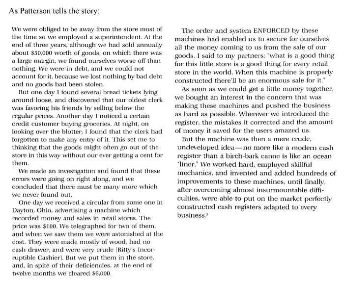 John Patterson merits some specific attention in that it was his innovative ideas and methods that succeeded in establishing NCR as the dominant force in the industry. Patterson was idolized within his company and he became a legend. He was feared, respected, understood and misunderstood – typical of a leader with vision and unstoppable drive to establish his will above others.