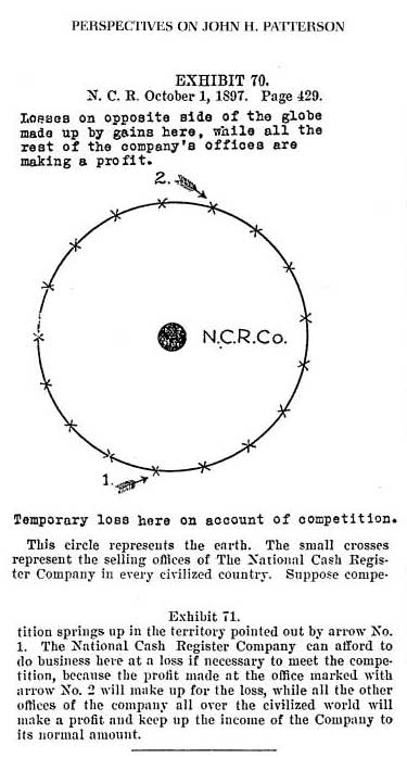 “In the discussion of competition at the meetings of the district agents, I remember John Patterson used a circle on the blackboard as an illustration. I have heard him make the illustration when he talked with competitors, that our money came from all over the world from the sale of machines and this money would naturally come in from all over the world but only one section was affected by competition.”
