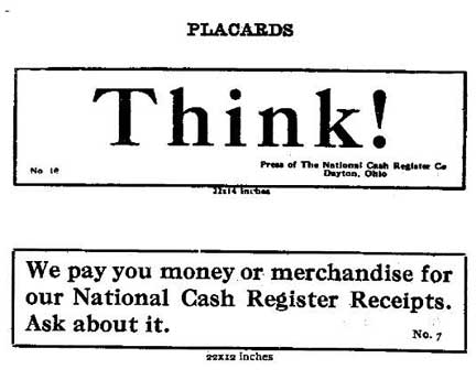 Here is the famous IBM motto “THINK” but this is a page from the NCR 1915 Trade-in Guide! “THINK” was coined at NCR in the winter of 1911 by Thomas Watson according to Frederick Fuller, My Half Century as an Inventor. THINK signs went up everywhere at NCR and eventually were even sold to the public in placard form. Watson often said “I didn’t think” has cost the world $ millions.”