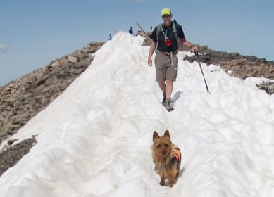 Quandary Peak is one of the most popular mountains to hike, a Class One “walk-up.” Rocky the Australian Terrier summited for the first time. He’s the grandson of “the fourteener dog” Emme who, after 17 summits has passed the age of 12.