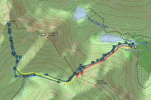 Here’s the route from our campsite up to Broken Hand Pass, which we did in total darkness. Note for later in the rescue part of the story the narrow, steep chutes (vertical shadows) which are the crux of this part of the climb. The red “path” goes up on the left side of the “fin” in the middle of the gully. Also note that there’s a longer, narrow and steep gully to the right of that fin – we’ll come back to that in the rescue part of the story.