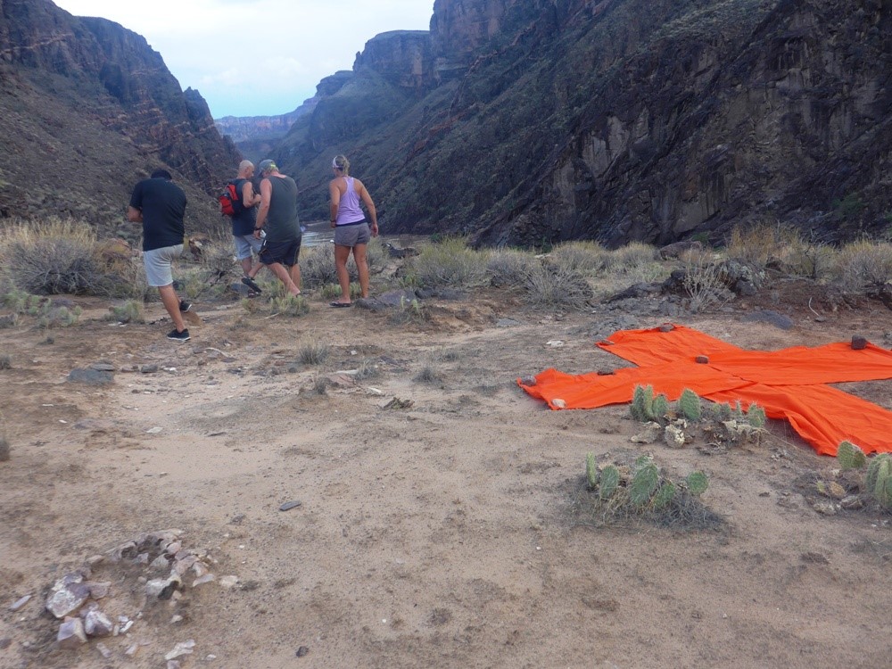 On day 4 Larry became concerned about the recurrence of a potentially serious medical condition, so out came the Sat phone, calling up the amazing (and busy) Park Service Rescue guys. This wasn’t Duffy’s first rodeo and he set about finding an LZ (landing zone) up from camp. Out came the red “X” marking the only spot safe enough for helicopter landing.
