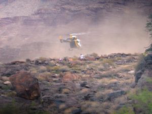 … and after two passes the heli raised quite a dust storm landing on the “X” … and off they went. Larry tells us 17 others had been pulled out at various points.
