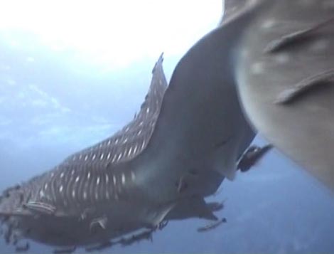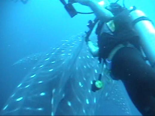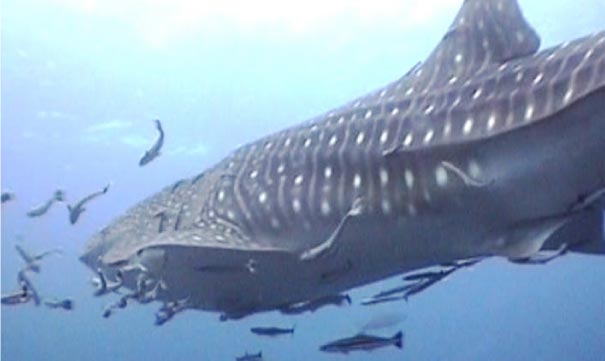 Eventually he started gliding down deeper and at about 110’ we decided it was time to let go. Sport diving limits are 130’ and even less than that some divers risk nitrogen narcosis. As I let go with my video camera still running, I almost forgot that their tails work by swishing back and forth rather than up and down and I almost got whacked – which is about the only way you can get hurt by a whale shark. They don’t eat people.