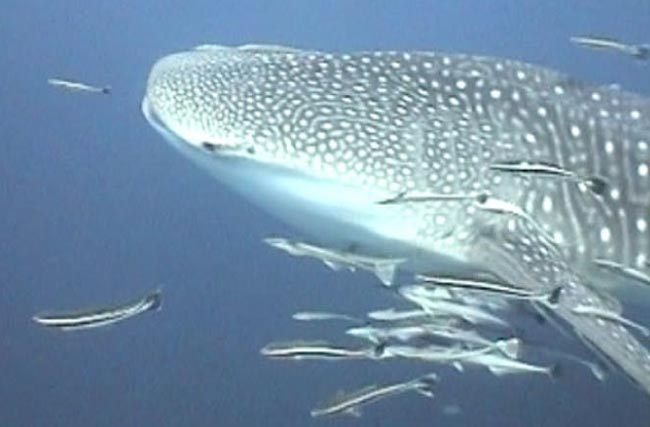 that a whale shark had been spotted. So, Brett, the naturalist and I headed straight out perpendicular from the rock wall into the open ocean at about 60’ depth and soon we spotted a huge dark shadow of a mass that became clearer and more spotted as we got closer.