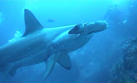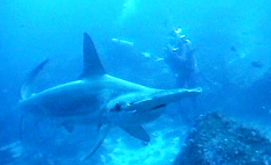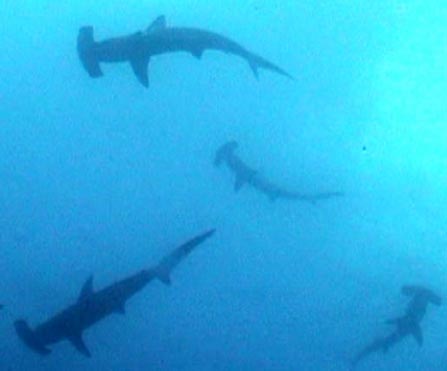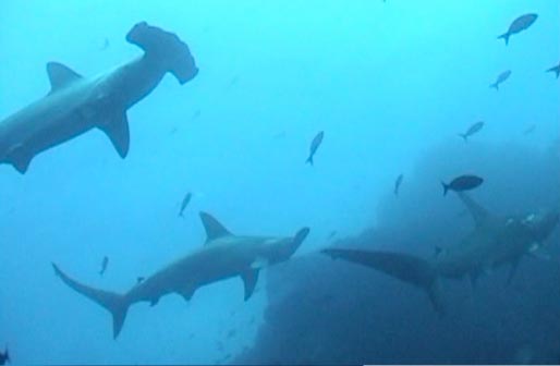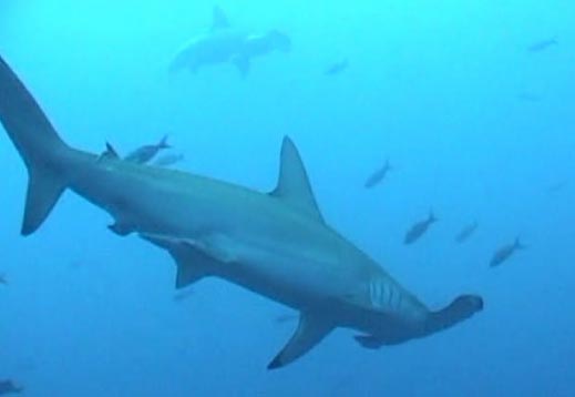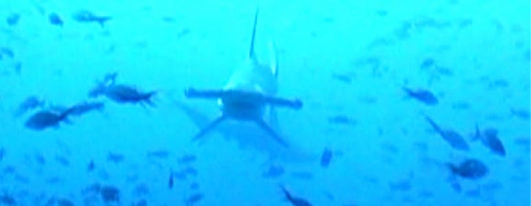 Just a few minutes later we swam to a drop-off that took us down to about 80’ and then we were really into the action – hammerheads right in our face!