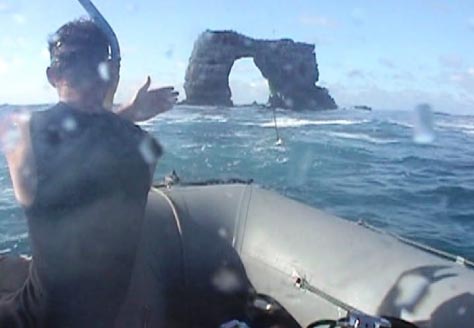 What we didn’t know was that the operator, a local, was engrossed in winding up all the fish line that we’d recovered from the illegal Chilean vessel (worth $$ in the local markets in Ecuador) and he wasn’t paying attention to the rapid drift we were making right towards the rocky thrash surrounding the Arch. The first clue we had that we were in danger was a thrust upward of the boat, with Brett and I hanging on to the outside in the water, and then we were slammed down on a major rock just below the surface. The noise of our tanks slamming on the rock was enough of a wakeup call.