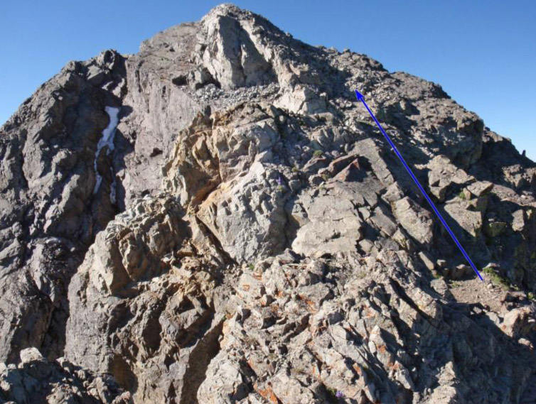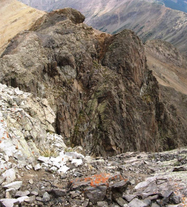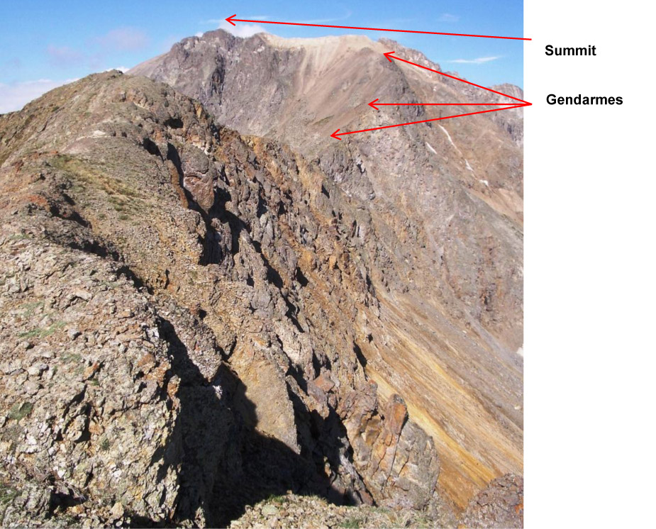 Why go no further? Look below. To gain the summit from the saddle, the ridge was blocked by three “gendarmes,” (from the French: “guards) – a climbers’ understated word for “you gotta work to get past me!”