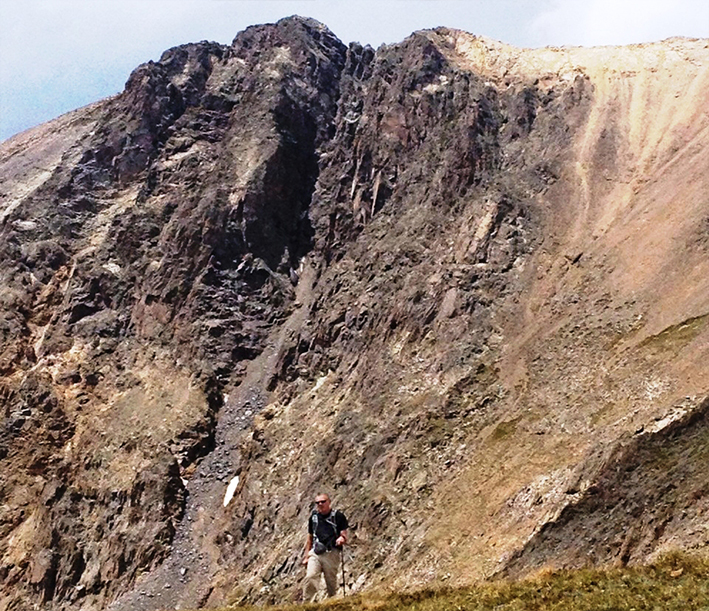 Rick just having come down the “slippery slope” on the right. Grizzly Peak is the higher one on upper left.