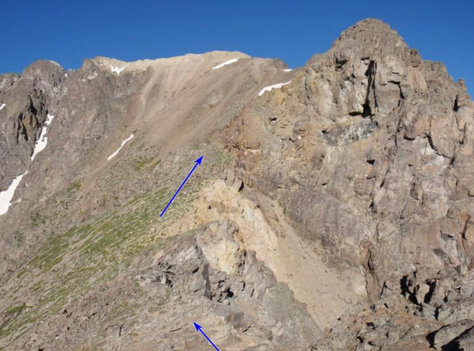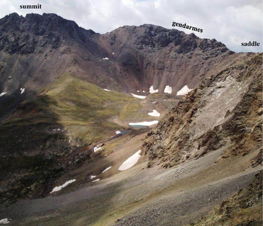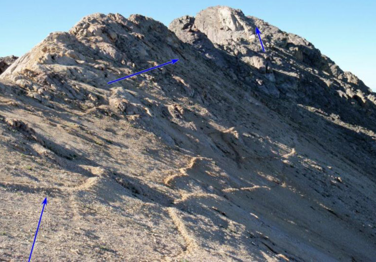 - Hike down to the saddle where you join the current “standard” way up to the summit.