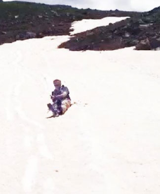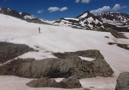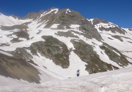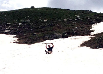 The final approach at 13,500’– no snow there, but high winds made it a trudge.