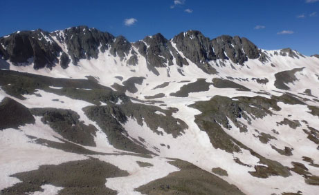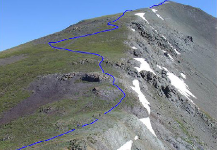Handies Peak is in Southwest Colorado in the San Juan Range, the largest and most beautiful mountain range in Colorado. The San Juans were created by volcanic activity 30 million years ago. What remains are 13 “calderas” which are collapsed volcanoes resulting in fantastic arrays of peaks, one of which surrounds the American Basin, our start for the day.