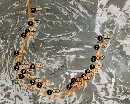 Our route to the summit, tracked by SPOT GPS (1 – 17 is up; 18 – 29 is down)