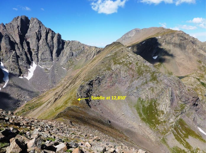 The climb consisted of hiking up to and around lower South Colony Lake (at about 11,300’) and across to switchbacks up to a 12,800’ saddle. From there it would get rocky and some exposed ridge hiking, past a false summit to the real summit, 3000’ of vertical and about 2 ½ miles.