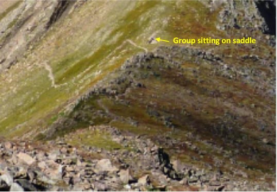 Well it was only 9am. I didn’t want to risk staying at summit until 11:48am. I figured all the more difficult parts of the climb were between summit and the saddle 1000’ down, so that seemed a better stopping place. If the weather came in fast, we’d be able to run down the switchbacks. When we looked down to the saddle we saw some folks already sitting there, presumably they hiked up just to view from there. So we headed down.