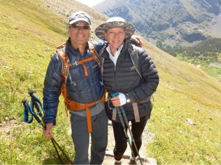 Here Rick P. and Donna are on the switchbacks with the sun re-appearing more fully. We were about to start peeling layers off.