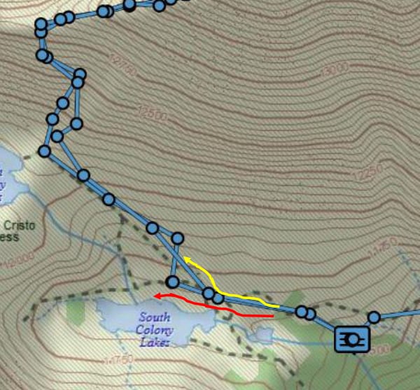 If you’re starting out in the dark for Humboldt, take a look below. Somehow in the dark we missed a fork that looks very obvious in the daylight. We took the path in red heading around the lake. We should have taken the path in yellow – we backtracked and found it.