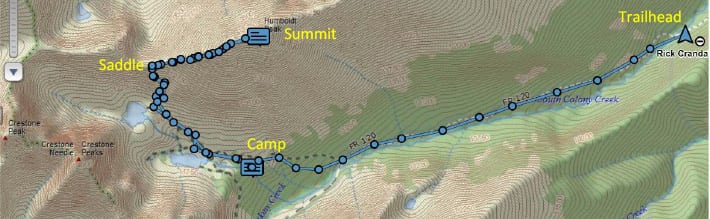 Here is our full GPS track down, from summit to saddle to camp and back out to the car.