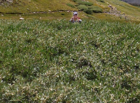 Rick P. tried bushwhacking straight uphill. The willows just busted him after a while – they even untied the laces on his boots!