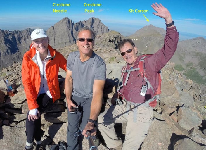 Summit Humboldt Peak at 14,064’, 9:00 am Monday, August 21, 2017, 4 ½ hours from Camp including getting lost. Three great 14ers are in the background.