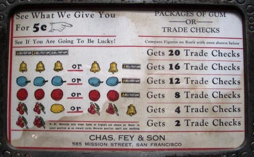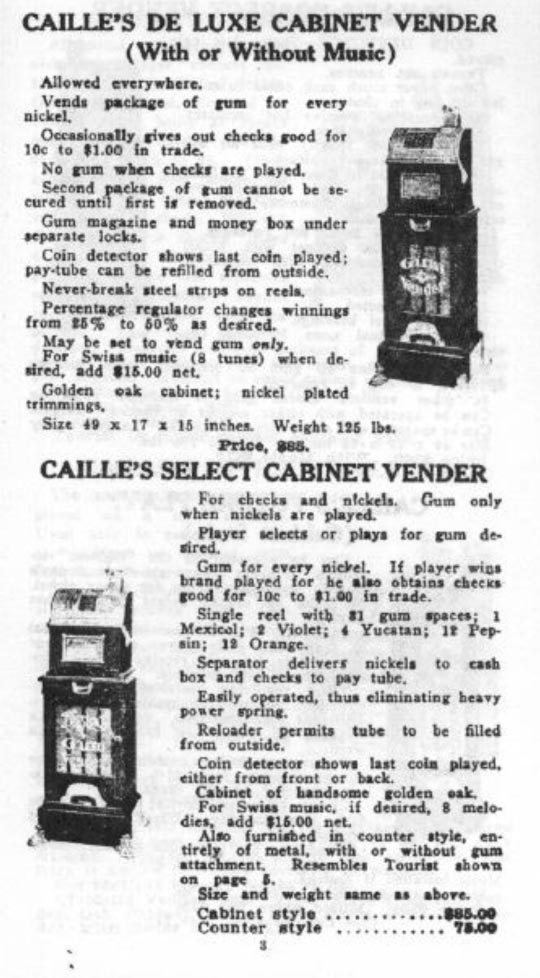 Adolf Caille produced a machine that dispensed a stick of stale gum (if you wanted it) for each play of a nickel (i.e. a “gum vendor”) but in addition you might win back some coin.