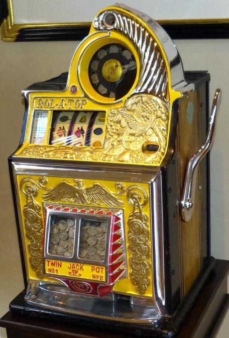 1930’s Watling Rol-a-top Bird of Paradise slot machine with double jackpot, rotating coin display (fancy way of spotting slugs), but still using the iconic cherries on reel strips that go back to the original 1910 Operator Bell.