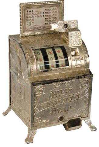 In 1905 a Fey Liberty Bell mysteriously appeared in the Mills Novelty Company plant in Chicago. Soon after, Mills had a Liberty Bell on the market with attractive cosmetics – an all-cast iron case with fancy patterns in the castings and nickel plated.