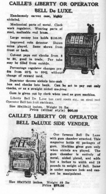 Mills was already an entertainment machine powerhouse and they were quickly followed by Caille Brothers of Detroit. Caille was the “Cadillac” of gambling machines which showed in the attractiveness of its case designs. Caille had a Liberty Bell on the market shortly after Mills, all around 1910.