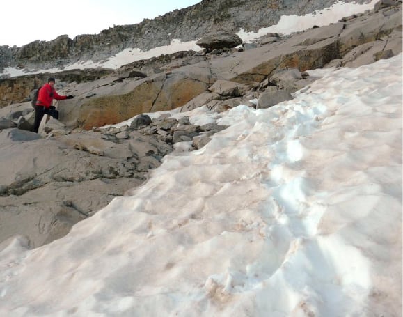 I stayed on the snow as long as I could. In this photo, up to the low point in the rocks where you turn right, and …
