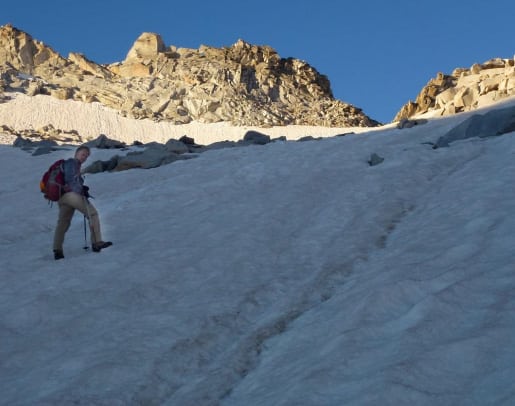By about 12:15pm it was time to start the long journey down and back to camp. I should have eaten more to replenish carbs and protein, but after being at 13,000 – 14,000’ for so many hours, I just didn’t have appetite. As we headed down I was fading. Andy tried to talk me into eating, but nothing would go down. We down-climbed very slowly taking great care to avoid a slip.