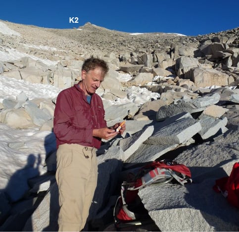 … that is when K2 comes into view for the first time, and still quite distant. As you can see, now we were into the rocks. The full sun was now out, and it was time for sun-tan lotion.
