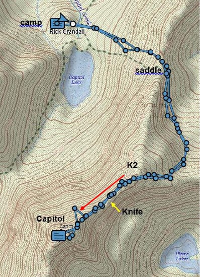 I’ve tried twice before to go for Capitol only to be turned back at K2 by an oncoming storm once (see that story at: https://web3.demodesign.live/wp-content/uploads/pdf/76 K2 and Capitol Peak First Try.pdf ) and then again by early-season snow last year. I’ve been determined that this summer, 2016, would be the magic. I started prepping physically in April. We needed two consecutive days of clear weather and I needed to ramp up my fitness. Just after July 4th I got the call from Andy: “weather looks good, but it’s still early season are you fit enough?” I wasn’t quite ready, but I jumped at it. He observed there was still snow in the boulder-field basin leading to K2 which could be a benefit –easier to hike with spikes and ice ax in the snow than boulder-hopping later in the summer.