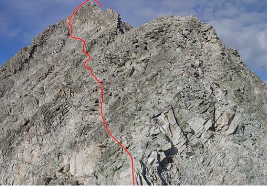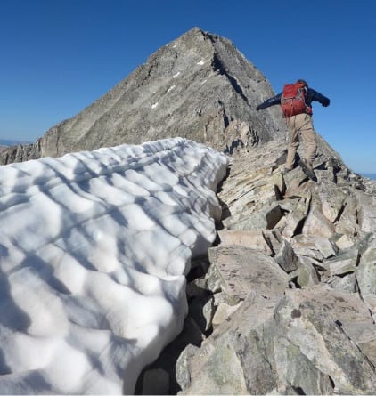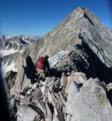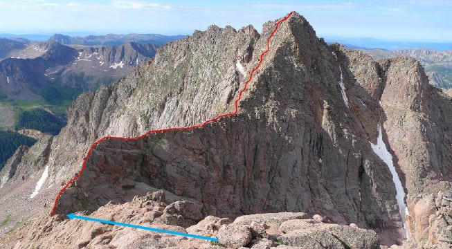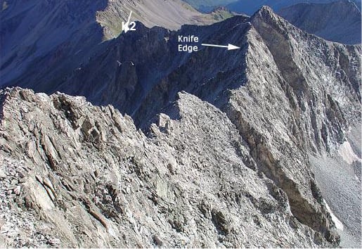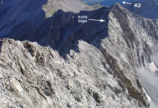 K2 is the smaller peak just before the infamous “knife edge” ridge on the way to Capitol Peak. It is named “K2” for its resemblance in shape to the world’s second highest peak in Pakistan. Despite the scary exposure of the knife-edge ridge, the actual casualties that do occur, are more often due to falls near the loose summit of K2 and by lightning strikes. The much-dreaded Knife Edge lies just ahead. This razorback catwalk at 13,600 feet is part of an 1800’ long highly-exposed ridge, but it’s a circus act without a net. Experienced scramblers will hand-traverse with fingers gripping the edge