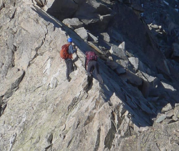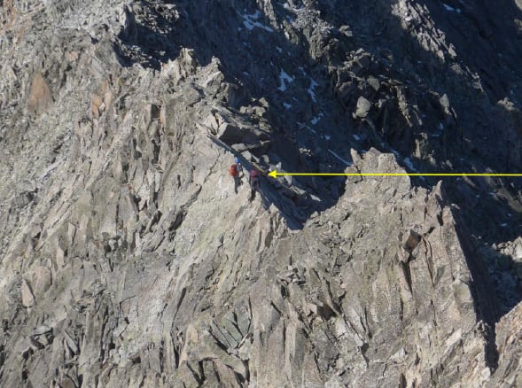 Here is a great shot I took from a former attempt when two of my climbing partners then, Rick Peckham and Susan Mishmash traversed the ridge and I stayed behind, believing I couldn’t outrun the oncoming storm I was seeing afar.