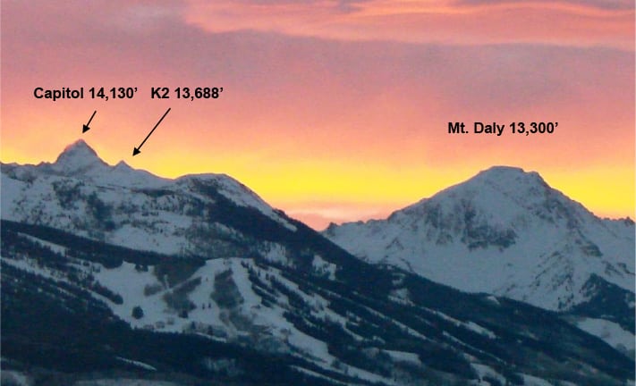 Capitol and K2 are part of the Elk Mountain range near Aspen. They are among the important peaks that I see from my house windows every day. Here are a few photos in various lighting conditions taken from my deck. Perhaps you can see why I’ve been committed to climbing them.