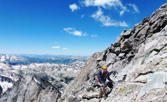 The first recorded ascent of Capitol Peak was by pioneer climber Percy Hagerman from Colorado Springs on August 22, 1909. Percy said: “There are no difficulties until the crest of the northeast ridge is reached two hours from the top. From this point on, the way is on or near the crest of the ridge and the climbing arduous. There is one rather sensational bit where the ridge is so sharp that one must get astride of it and move along with hands and knees. The drop on the north side here is something like 1500 feet, appallingly steep and smooth. The greater part of the north face of Capitol, some 2500 feet high from the lake at its base, is an exceptionally steep and smooth rock wall. As far as we can learn no other party has ever been on Capitol Peak and it was reputed to be unclimbable by the local ranchmen.”