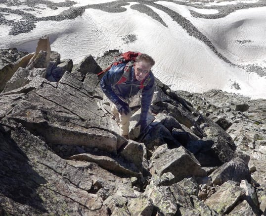 Rick scrambling to summit K2. Most of those rocks are loose. If you wanted to you could pull this peak apart with your bare hands and sometimes they do that on their own – the source of many Mountain Rescue calls, one of which had just occurred the day before.