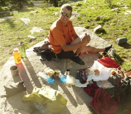 Some of the many items in Andy’s pack were prosciutto, cheese, crackers, many other goodies … and a bladder of Walter Hansel Pinot Noir I always bring. It is my favorite for the outdoors and the type of food we like on a campout. Andy slept just in a sleeping bag next to that rock. I preferred my tent 🙂