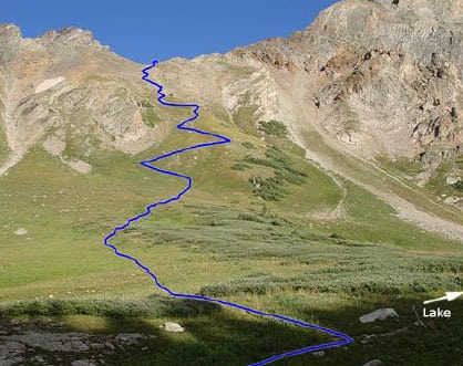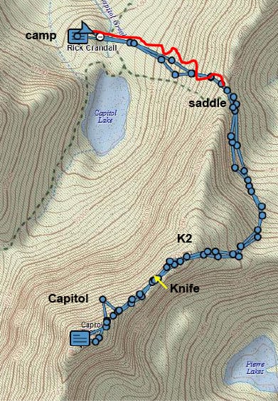 We planned on rising very early in the morning, a 3 am wakeup to be on the first leg of the climb in the dark at 3:30 am. That is a 900’ hike up switchbacks (shown in red) to the saddle between Capitol and another iconic peak, Mt. Daly, a 13er.