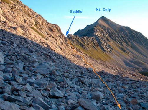 This is what the other side of the saddle looks like if one could see it in daylight and with no snow. It is the beginning of the longest and most arduous boulder-field of any 14er which can be very tiring even before getting to the real climb.