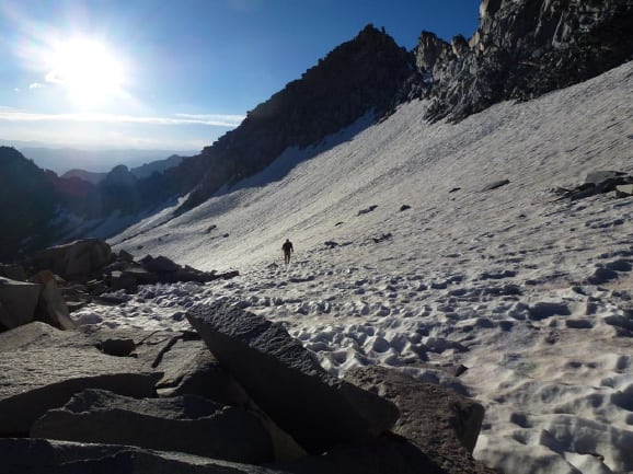 We hiked the boulders down to the snowfields where we were able to glissade major parts of the basin. Our asses got cold and wet, snow jammed between my back and my pack but I didn’t care. The weather was glorious, we had bagged our peak and now we were kids having fun.