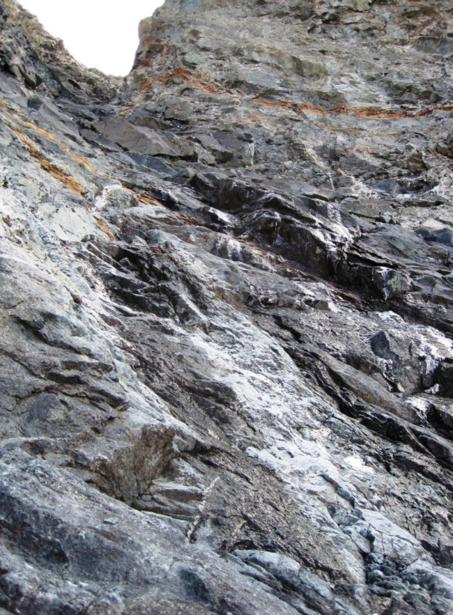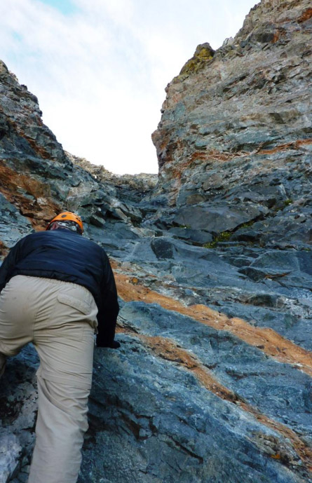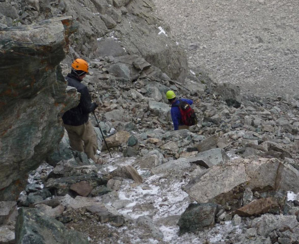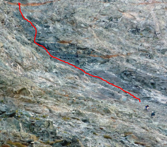 Rob and Jeff (lower right) approaching the hourglass – which is the major reason why this mountain is ranked the toughest. It is steep, loose, smooth (i.e. no good handholds) and has water running down the middle.
