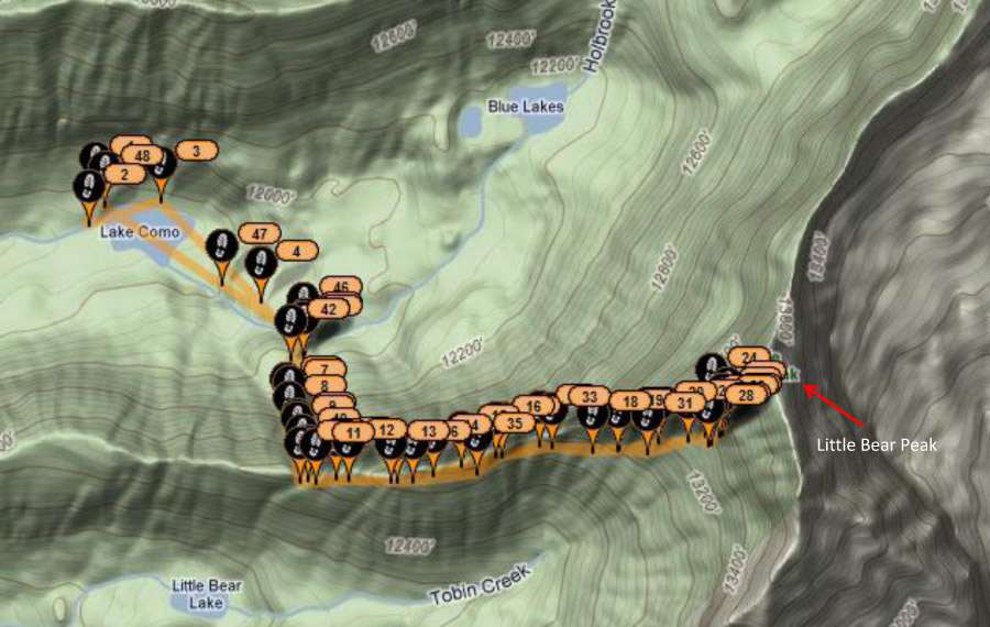 This is Spot tracking (satellite fix every 10 minutes of the climb) – note we got to #24 in the hourglass before turning around. The summit is so close its designation is partially covered (red arrow).