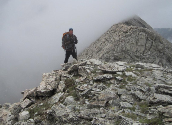 Andy with bad weather and lots of ridge behind him and he was still toting his pack and mine – I needed whatever strength and balance I could gather for the slippery down-climb to come.