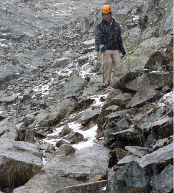 Ugh, more snow. Just above this in the final rocks of the lower boulder field, maybe 20’ from this final approach to the campsite – I slipped on a rock and fell – bumped an elbow, to which Andy exclaimed, “Oh, no – if you get a bruise everyone will think I wasn’t looking out for you.”