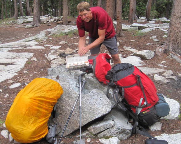 I was not confident I could backpack much more than 30lbs up that kind of elevation gain, so Andy took on everyone’s extras, including my tent, some stuff from the other guys, food and wine that I bought (11 lbs.), two stoves and fuel … even a dozen fresh eggs!