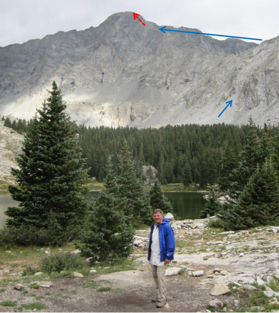 We reached Lake Como at about 5 pm – and there was Little Bear Peak right in our faces, with the steep, loose gully, the long ridge and the peak in full view. However, the crux of the climb, the “hourglass” (red dotted arrow) is not in view from this perspective.