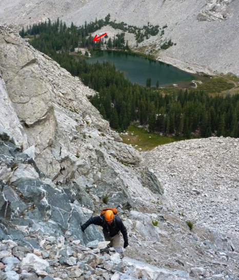 Rick heading up the steep, loose gully. Red arrow shows the campsite.